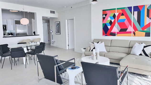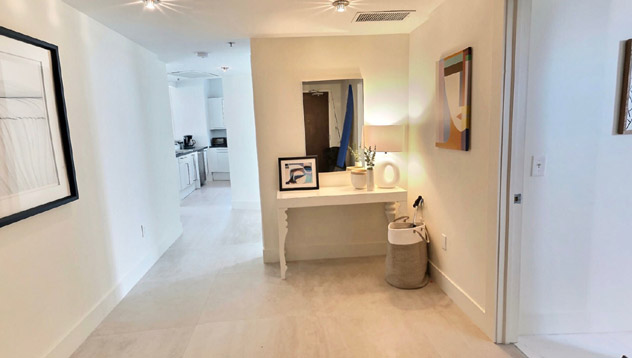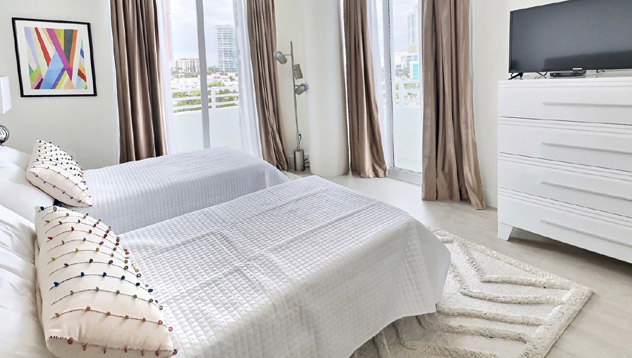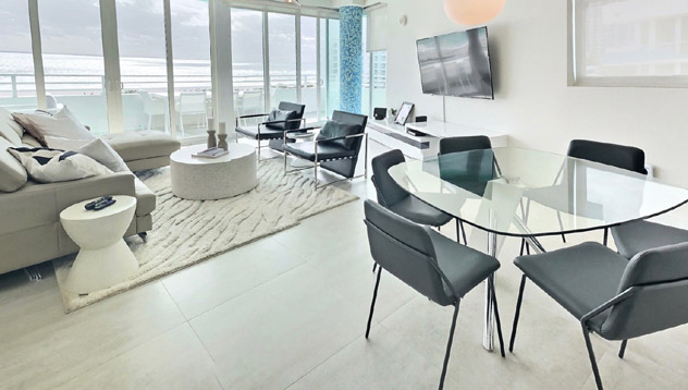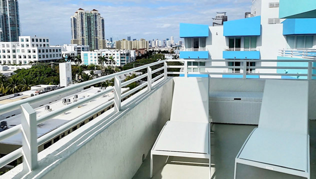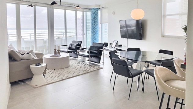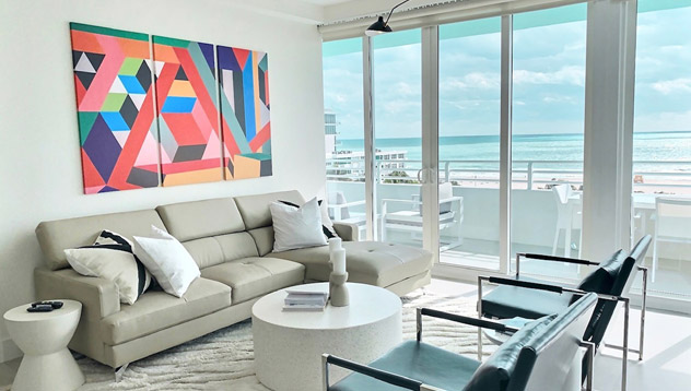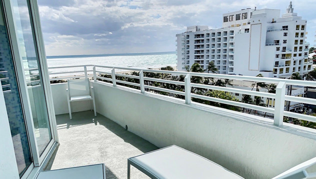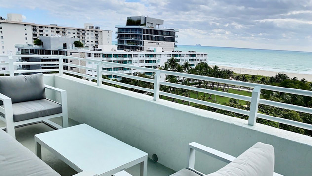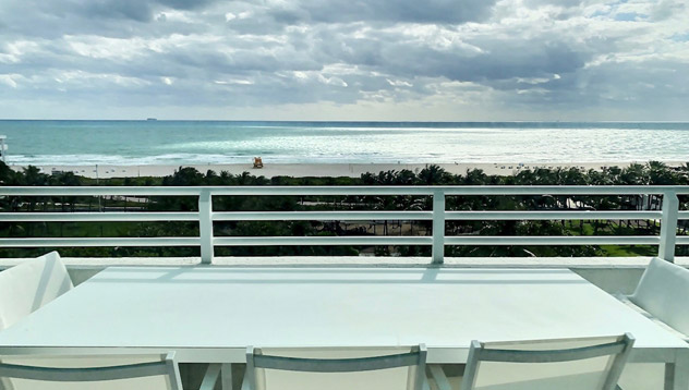 This incredible 2-bedroom, 2-bath condo is extremely spacious and is owned by the former wife of Rolling Stone Ron Wood. It features an enormous balcony overlooking the famous Ocean Drive and unique touches throughout. Fully updated fall 2016 with all new furnishings. The kitchen features intricate mosiac tilework and has everything you'll need to prepare meals during your stay.