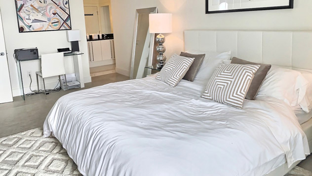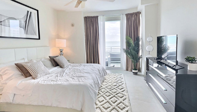 The master bathroom features a separate dressing area, full soaking tub and walk-in shower. The master suite has a king bed bed and flat screen TV with views to the pool and access to the front balcony. The second bedroom has a queen bed and second bath has a marble walk-in shower. The living room and dining area are very spacious with seating for 6. The couch is also a sleeper sofa.